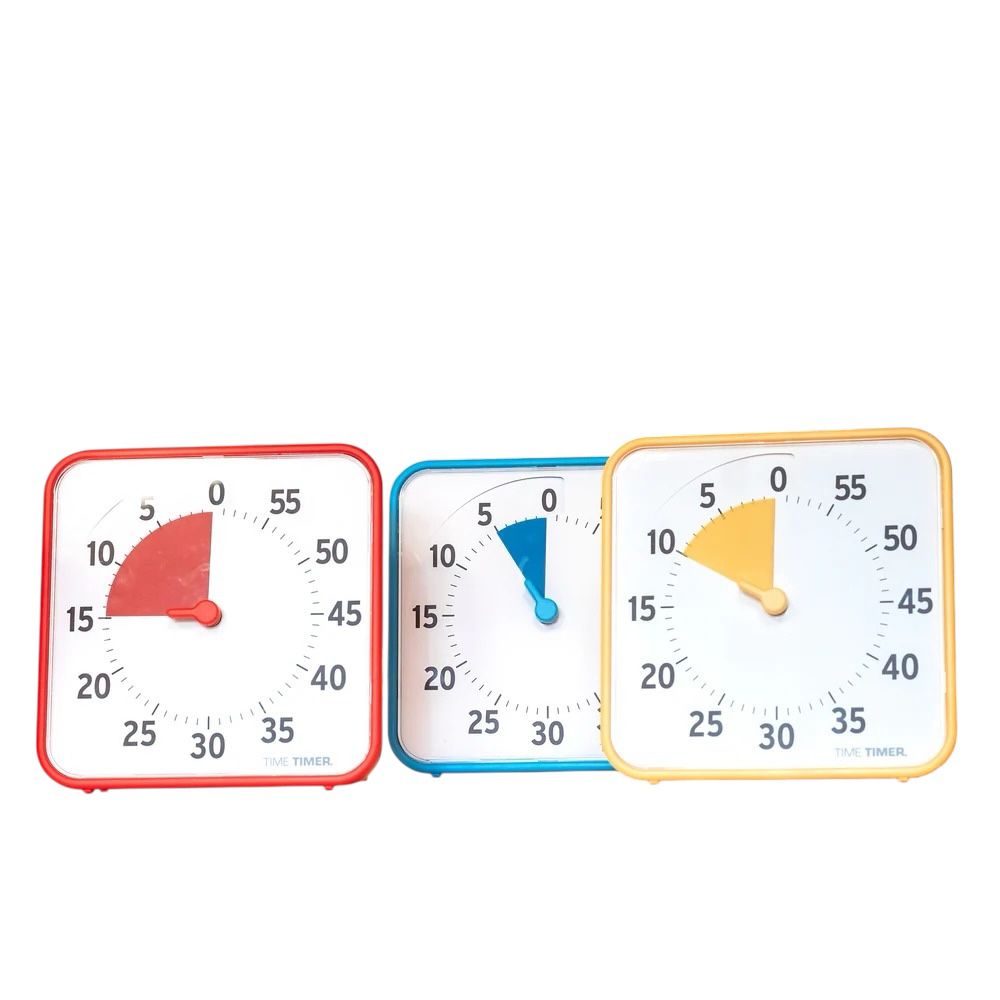 El Temporizador Original de 8" está disponible en un paquete múltiple de tres. Cada set incluye tres temporizadores de diferentes colores para facilitar el currículo de colores durante la primera infancia y la gestión del tiempo en terapia con código de colores.